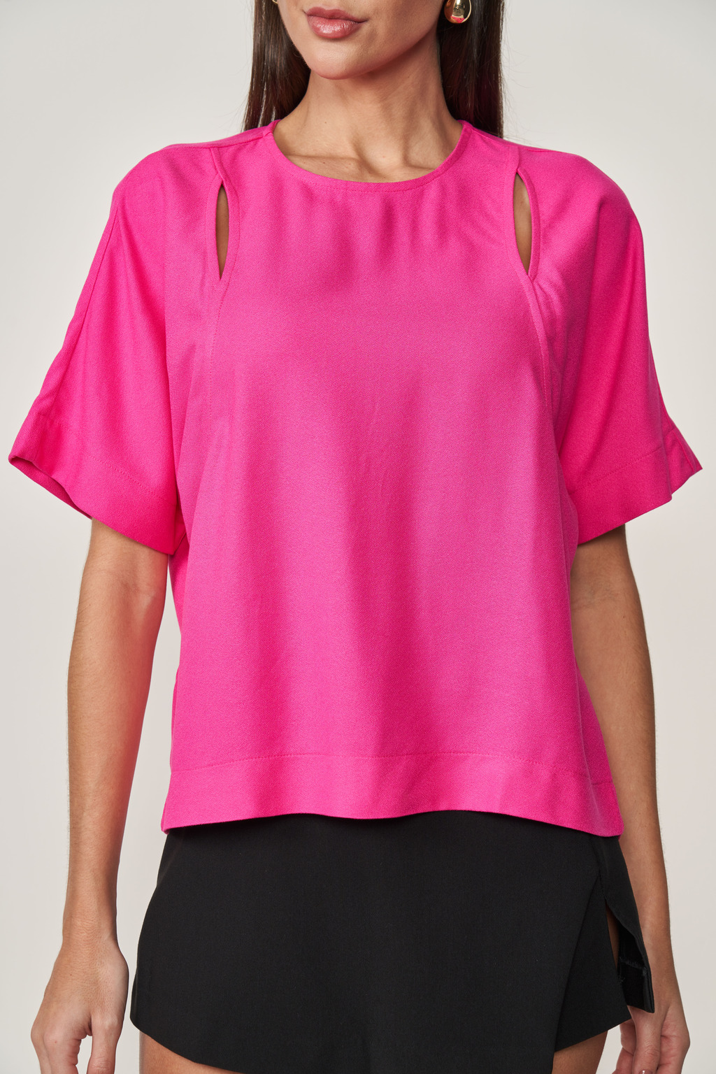 Blusa: Gola redonda, mangas curtas, modelagem soltinha, detalhe de abertura lateral nas laterais, tecido leve e fluido, cor vibrante.
