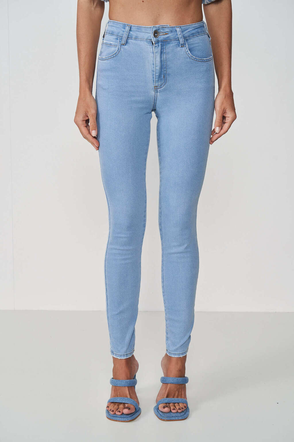 Calça Jeans Bia: Modelagem skinny, cós alto, cinco bolsos, fechamento frontal com botão e zíper.