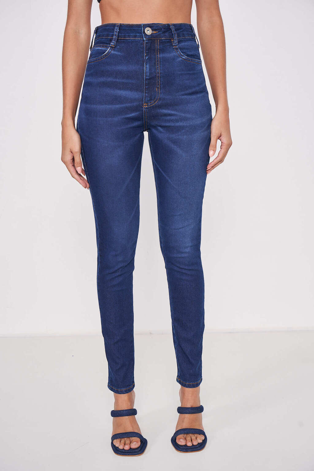 Calça Jeans Bruna: Modelagem skinny, cós alto, cinco bolsos, fechamento frontal com botão e zíper.