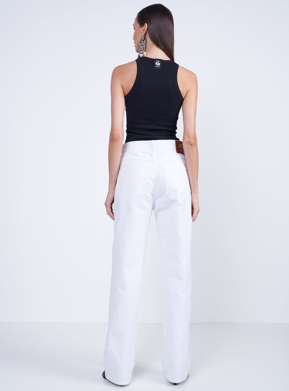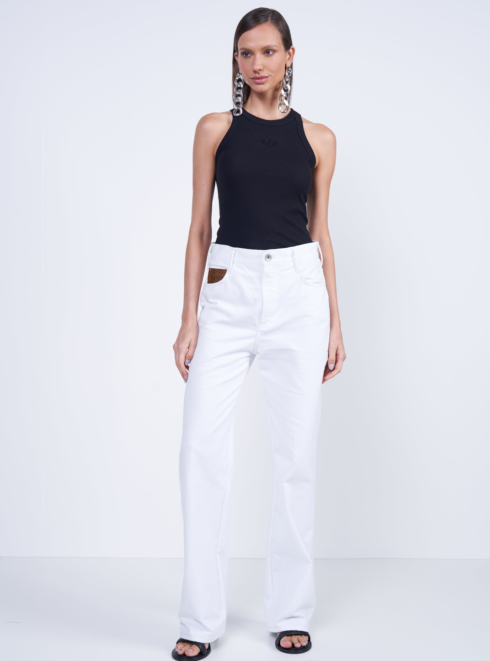 Para combinar com essa diferenciada, uma ótima opção é um Top. Opte por um top mais ajustado, que destaque a cintura evidenciando o botões destacados da calça.