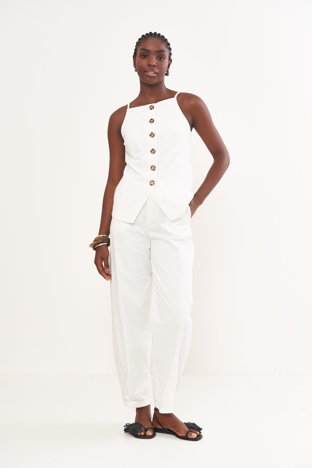 A Calça Joana é a personificação da elegância despojada, uma peça que celebra a leveza e a autenticidade da coleção RIVIERA. Seu design, que equilibra a sofisticação da alfaiataria com o conforto da sarja de algodão, é um convite para viver os dias ensolarados com um frescor inovador e muito estilo. Os detalhes de costura contrastante elevam a peça, tornando-a um item essencial e cheio de charme.
