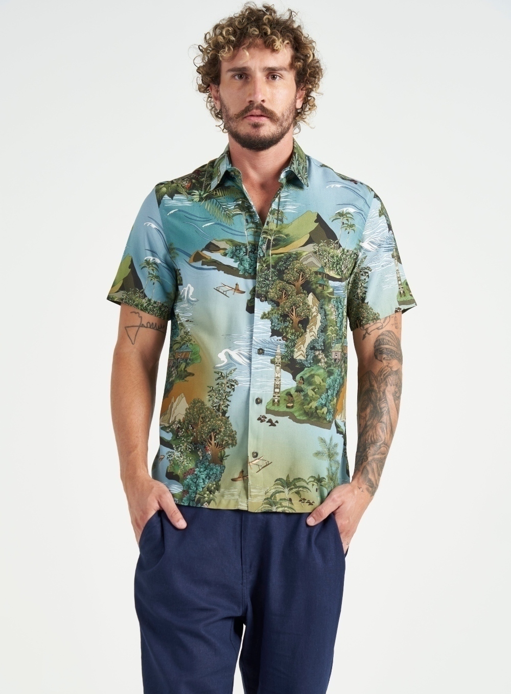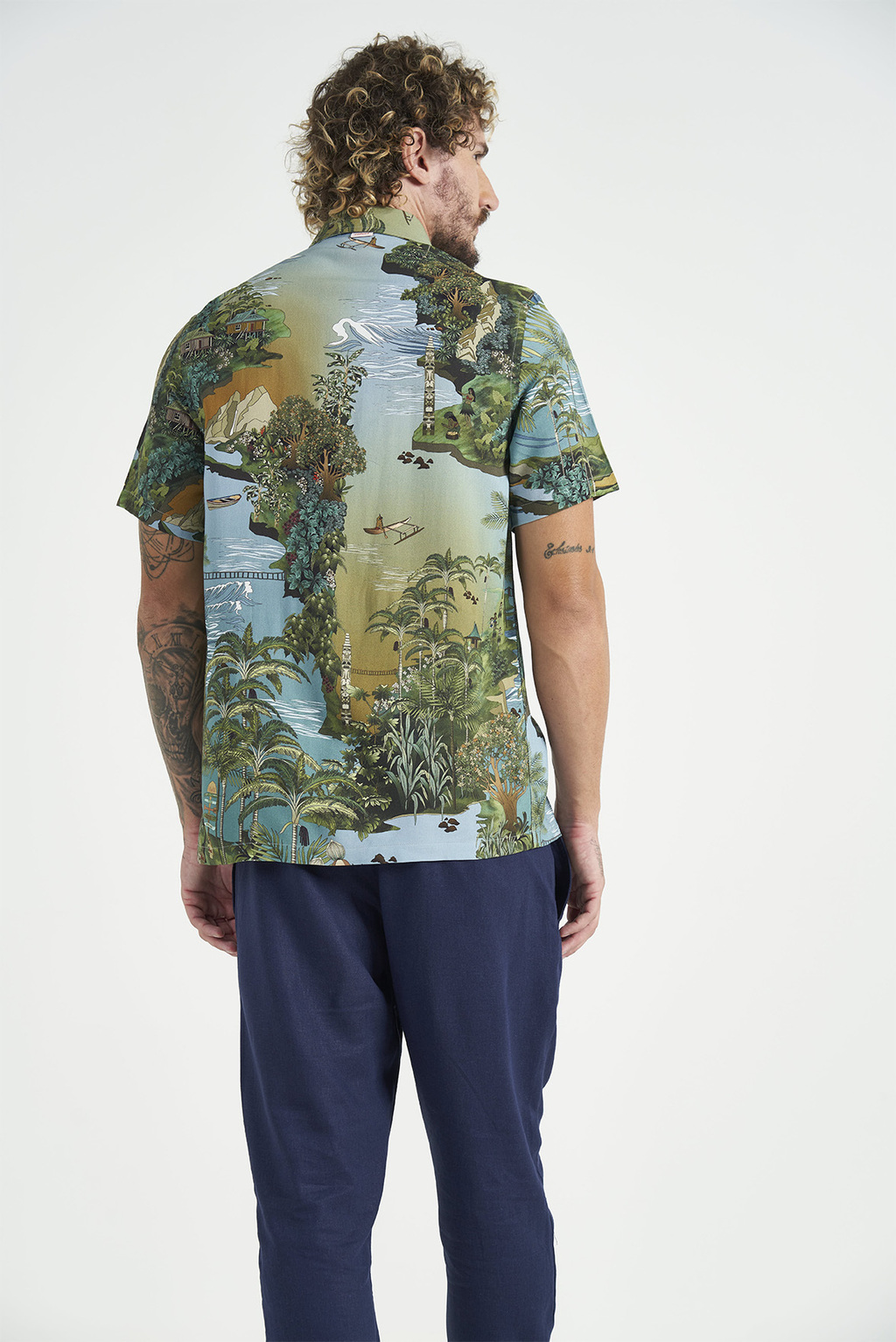 Camisa apresenta shape relax e modelagem comfy. A peça possui estampa exclusiva Primavera 23, gola dupla com abotoamento frontal, manga curta e comprimento médio.