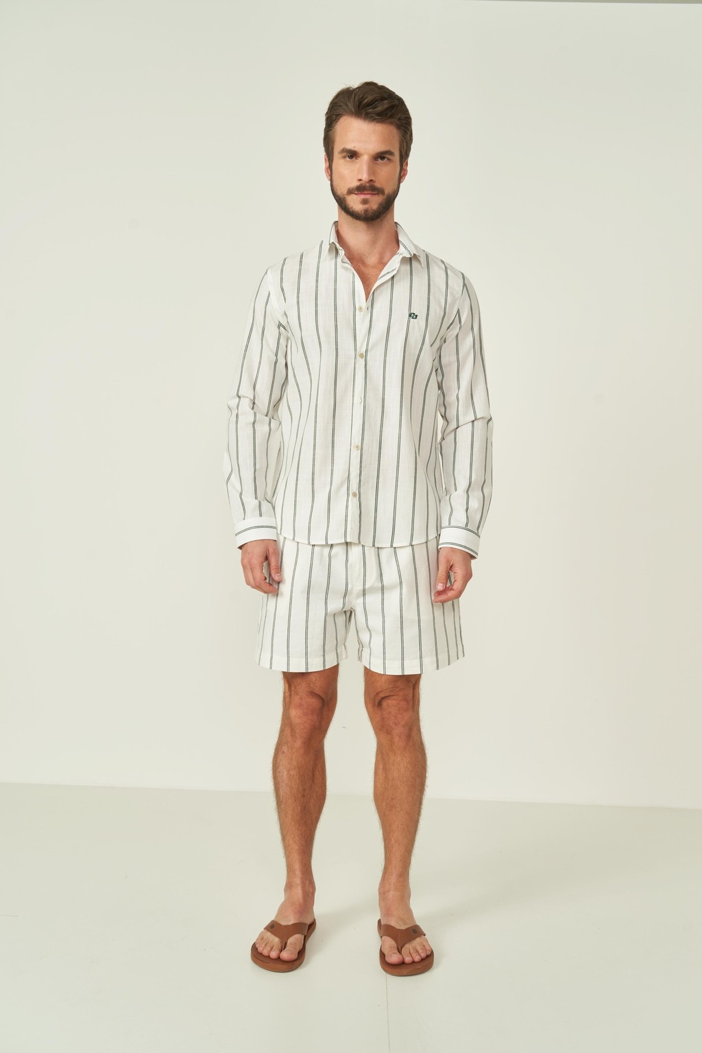 Para um look que exala a leveza e o estilo do verão Colcci, combine esta camisa listrada com os shorts coordenados da mesma padronagem, como na imagem, para um conjunto casual e moderno. Use-a com as mangas dobradas para um estilo mais despojado. Adicione chinelos de couro ou tênis brancos para um toque confortável, perfeito para um passeio à beira-mar ou um almoço informal. Para um happy hour, experimente com uma calça de linho branca e sapatênis. Esta peça é a base versátil para looks que celebram a autenticidade e o frescor da estação, do dia à noite.