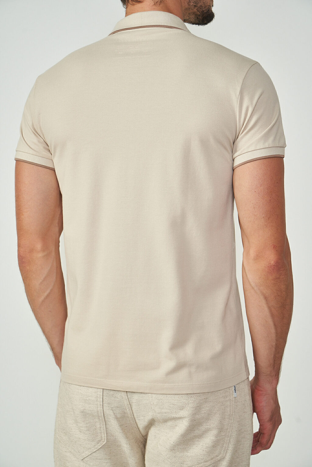 Camisa: Gola polo com detalhe em ribana, manga curta, caimento slim.