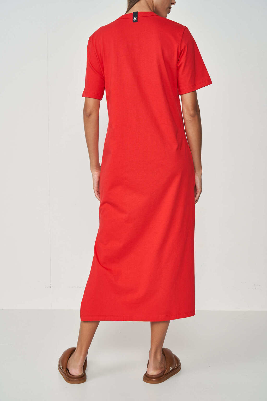 Vestido midi com mangas curtas, decote redondo, fenda na lateral e caimento soltinho no corpo.