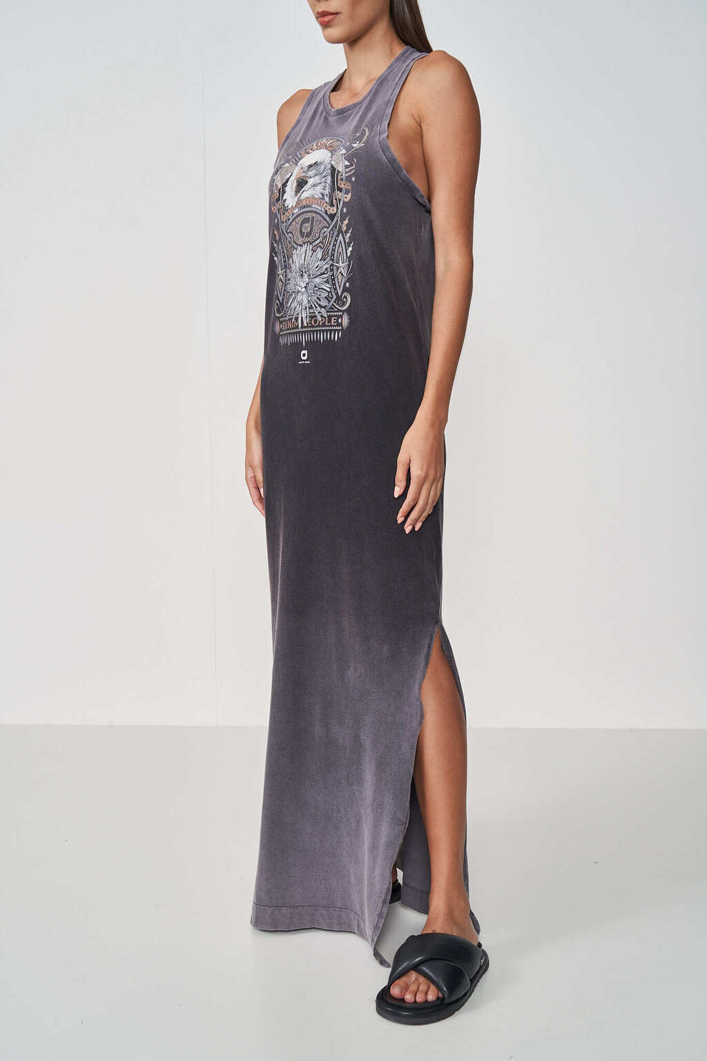 Vestido longo, sem mangas, com decote redondo, estampa frontal, fenda lateral, modelagem soltinha e caimento leve.